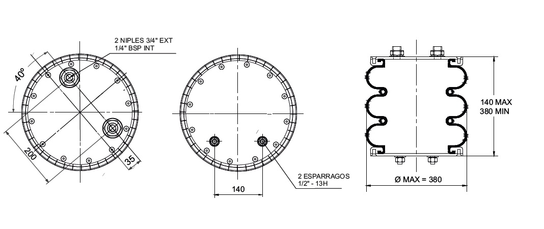 C.DE AIRE TRILOB.Tipo 5 (40º)- C/2 NIPLES DESP. A 200 MM Y DOS ESP. 1/2" DESP. A140 MM